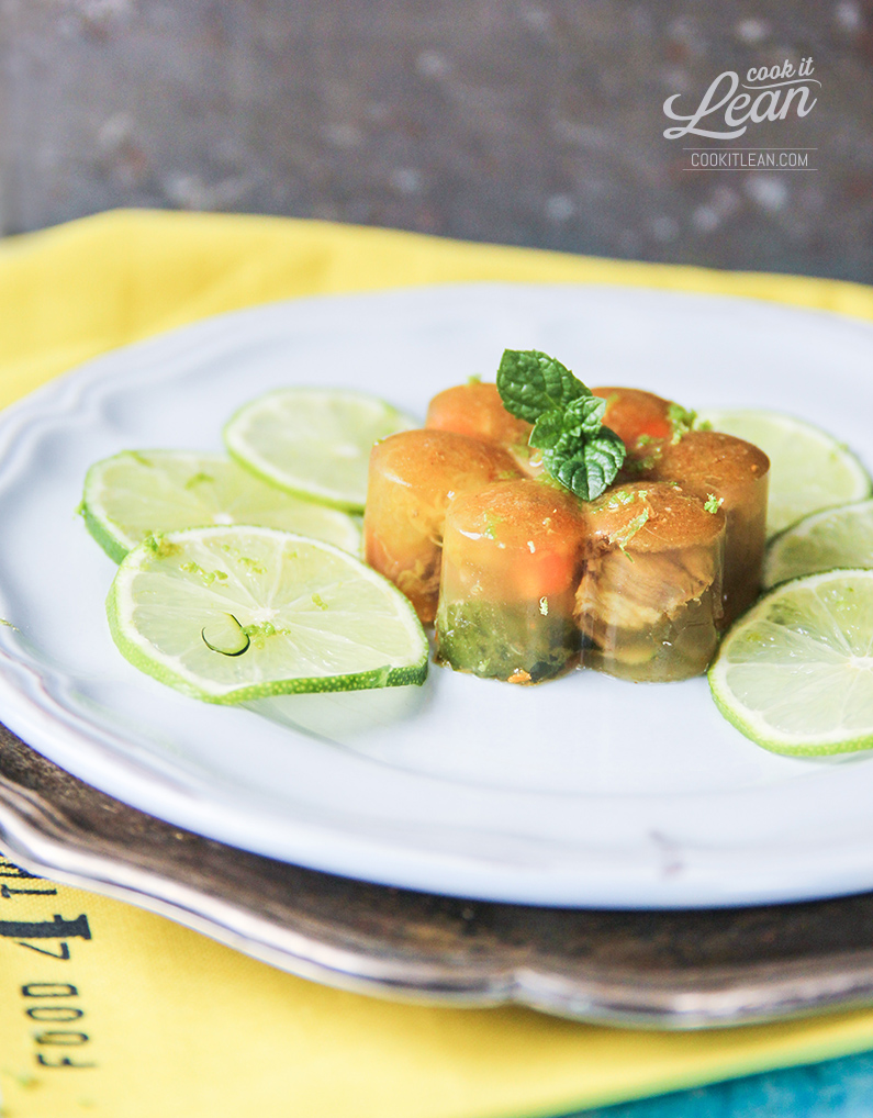 Wystudzony bulion z pastą i z kurkumą rozlewamy do foremek, do 2/3 wysokości. Do każdej z nich dodajemy kawałki mięsa, pokrojoną w plasterki cukinię, miętę i bazylię. Odstawiamy do lodówki aż galaretki stężeją.